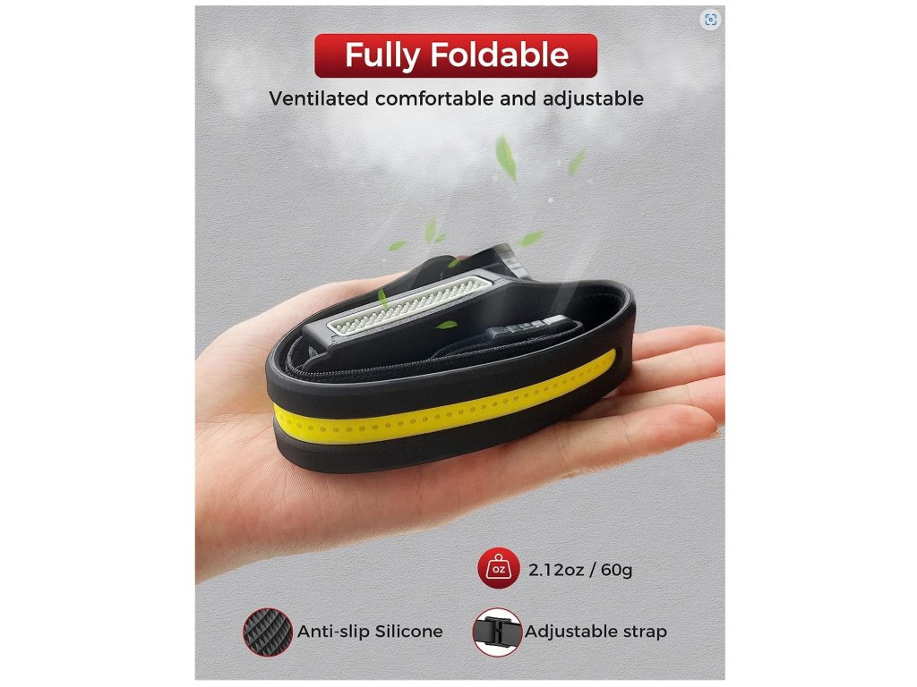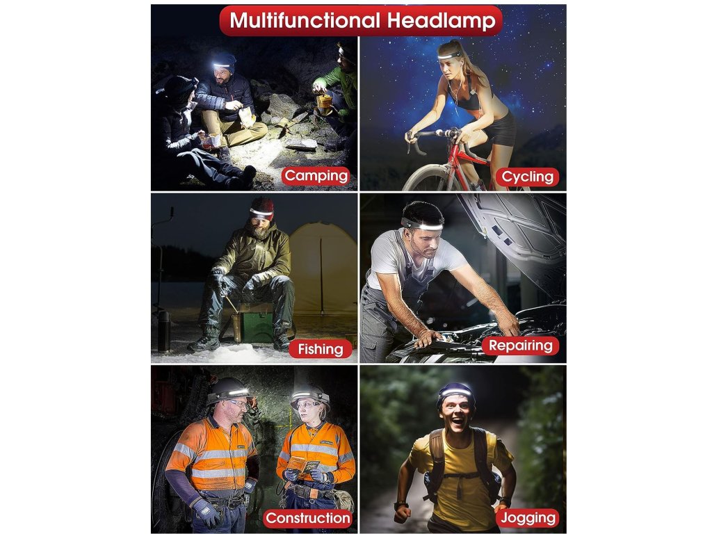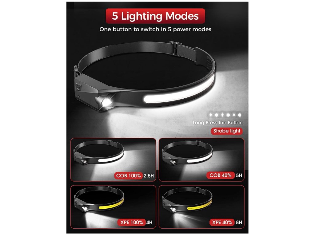 - 【 Inteligentní senzor & 5 světelných režimů 】Čelovka LED má 4 režimy jasu: COB vysoká bílá/ COB nízká bílá / XPE vysoká/ XPE nízké / XPE nízké.