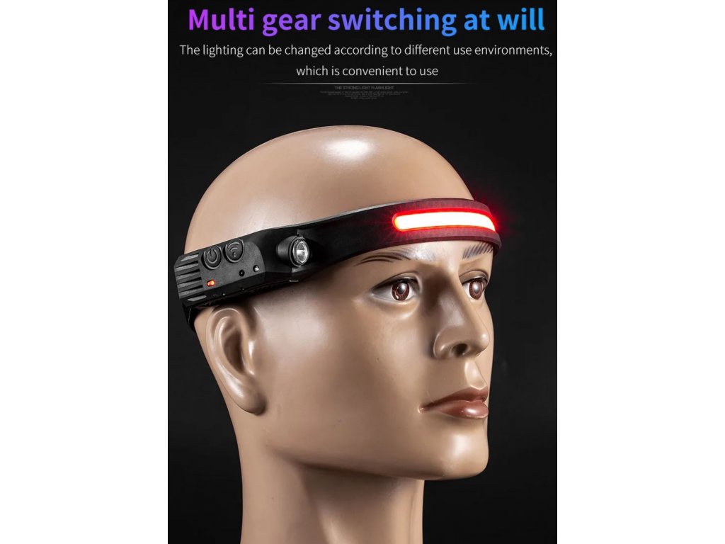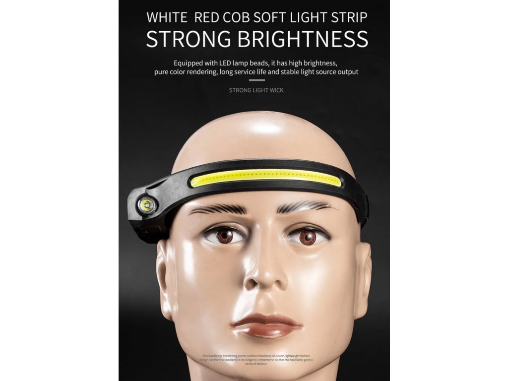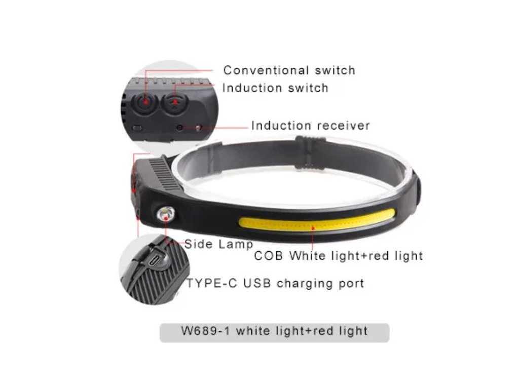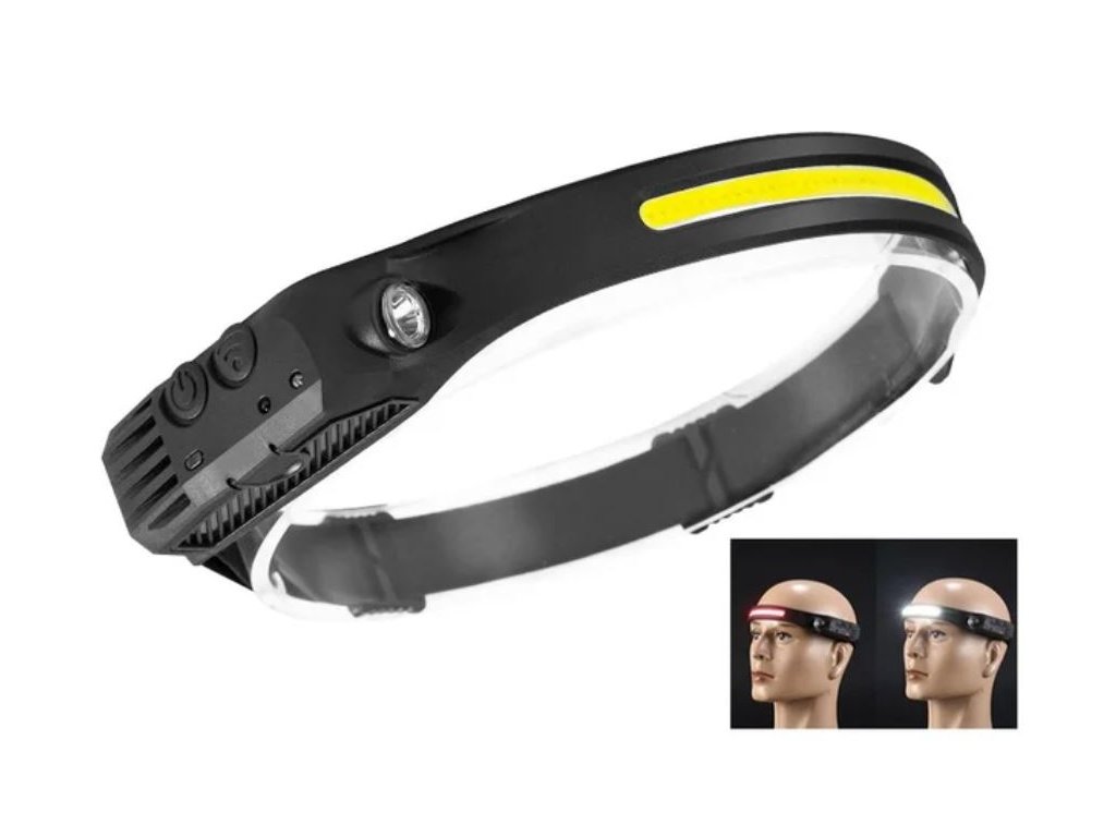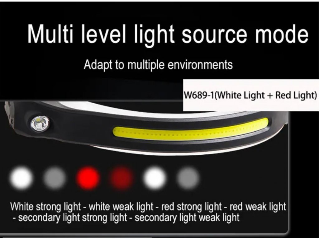 Čelovka W689 se světelným pruhem COB 230° IPX4 vodotěsná dobíjecí USB s pohybovým senzorem až 350 lm + červené COB světlo pro noční vidění + vylepšená baterie + 3 v 1
