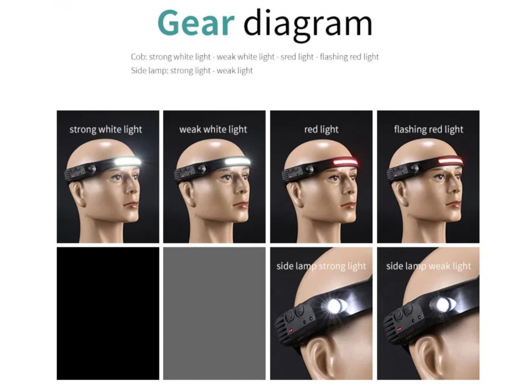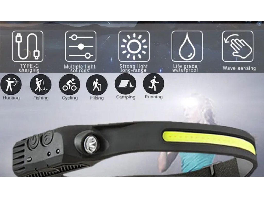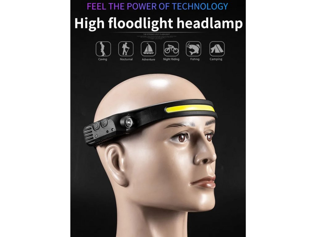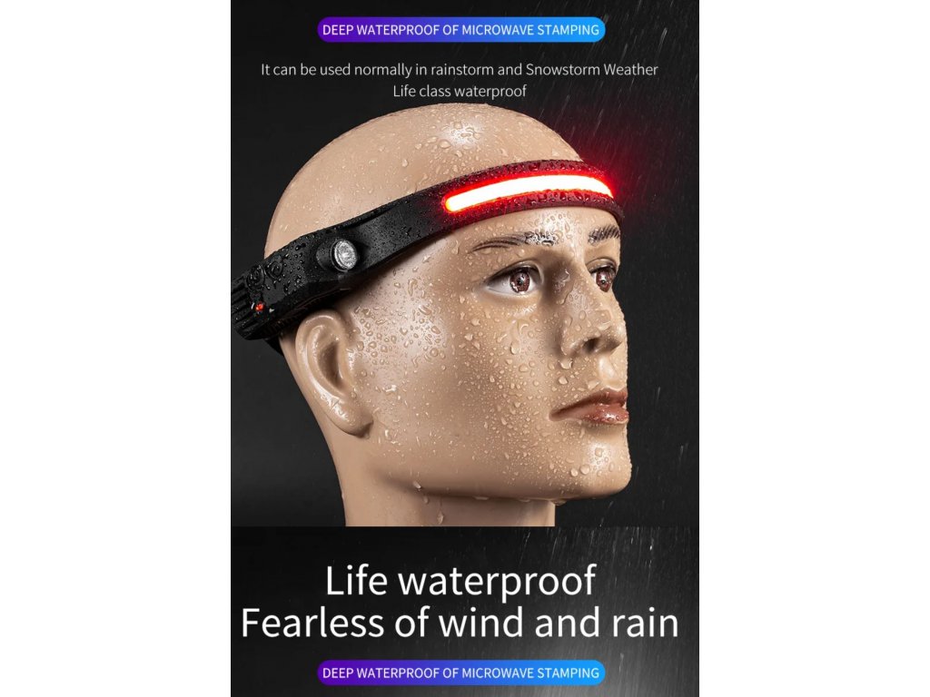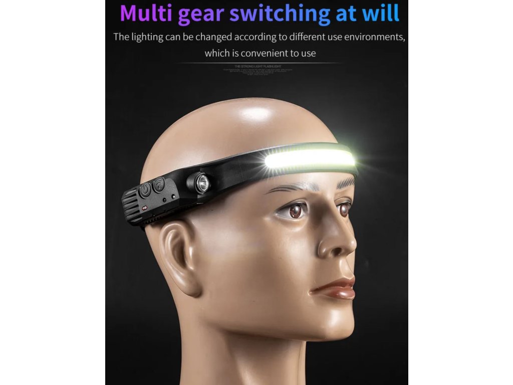 Čelovka W689 se světelným pruhem COB 230° IPX4 vodotěsná dobíjecí USB s pohybovým senzorem až 350 lm + červené COB světlo pro noční vidění + vylepšená baterie + 3 v 1