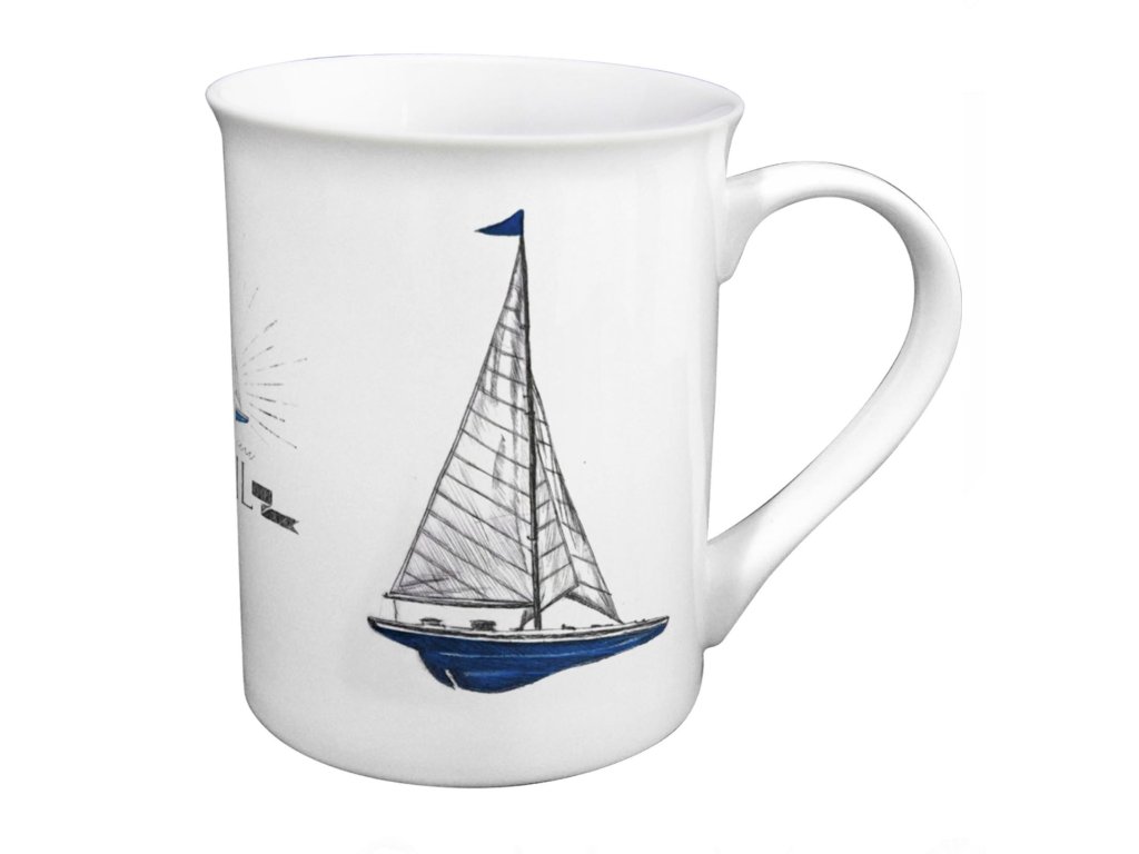 Kvalitní porcelánový námořnický hrnek s červenočernou nebo modročernou kresbou plachetnice.
