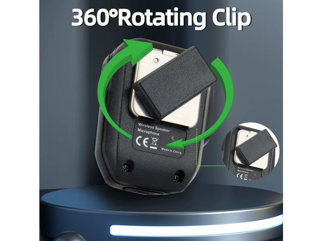 Robustní otočný klip umožňuje upevnění mikrofonu na vestu, popruh, opasek nebo batoh.