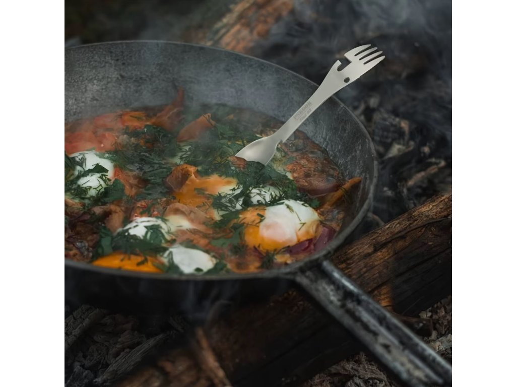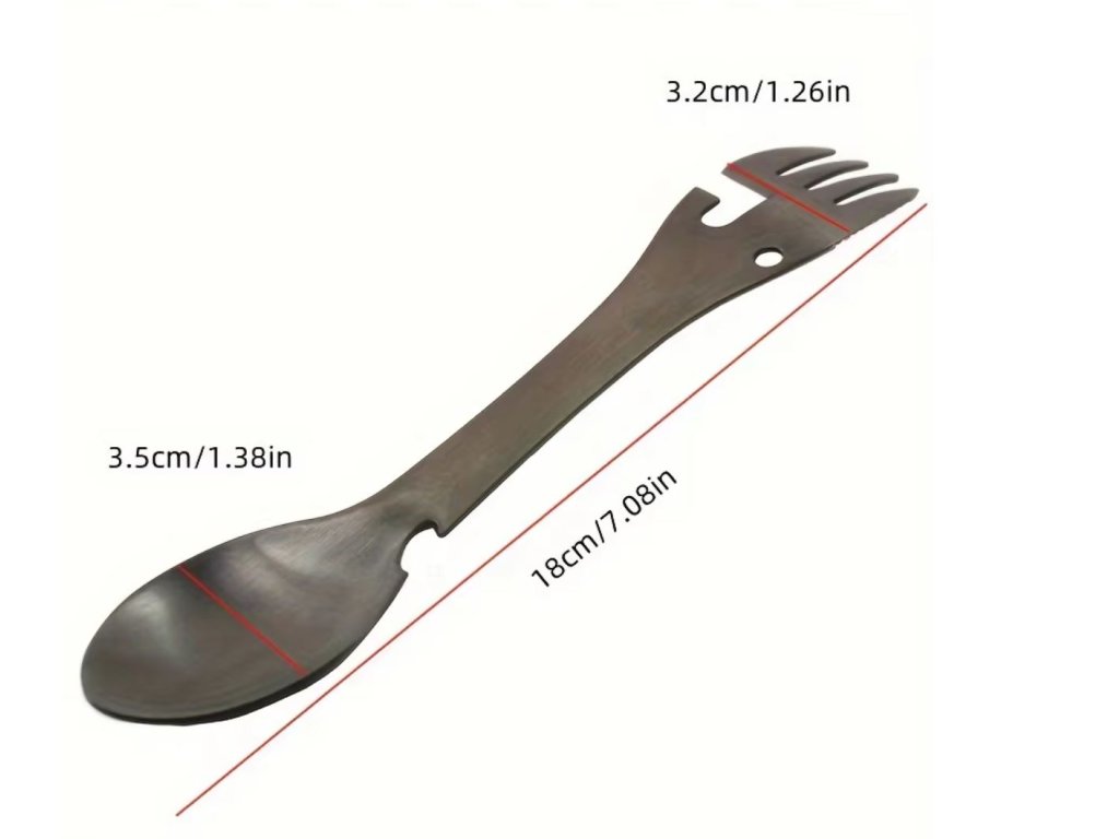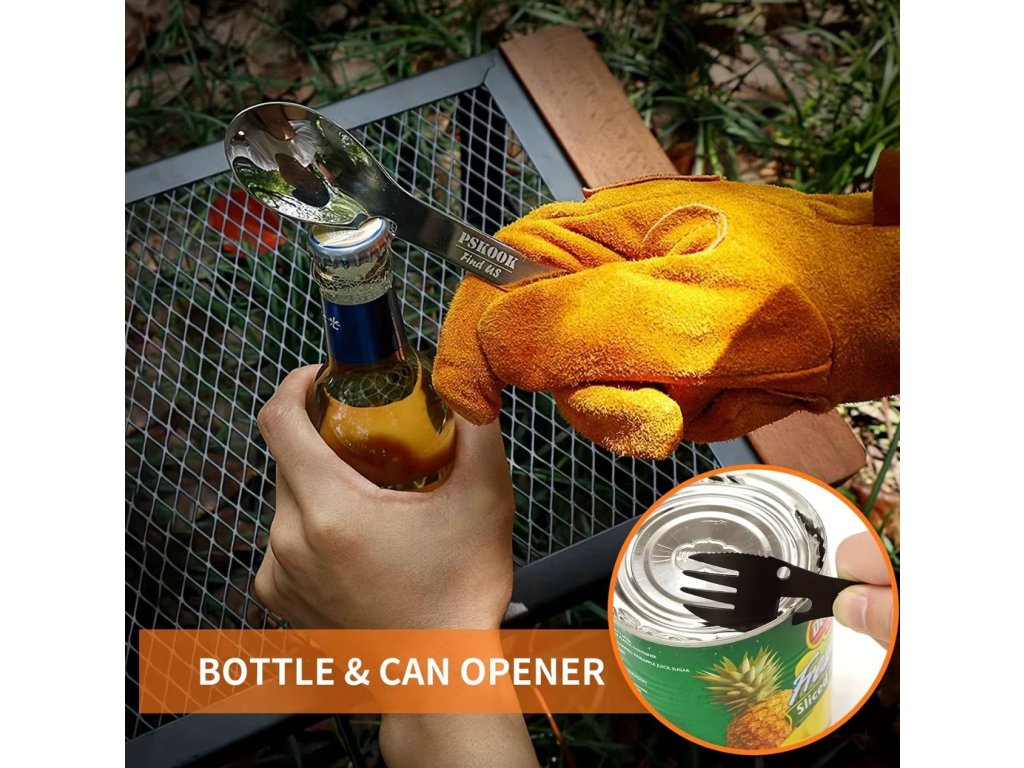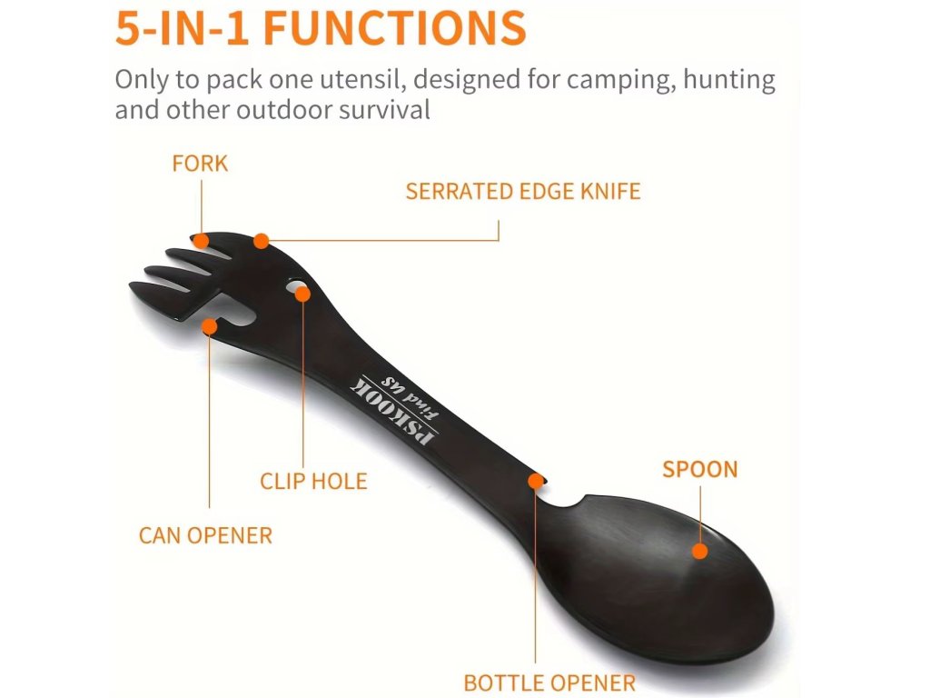 Tento kompaktní 5v1 outdoorový nástroj kombinuje lžíci, vidličku, nůž, otvírák lahví a otvírák konzerv v jednom pevném těle. Vyroben z vysoce odolné nerezové oceli, která zvládne i náročné podmínky v přírodě. Perfektní vybavení pro kempování, turistiku, bushcraft, EDC a nouzové situace.