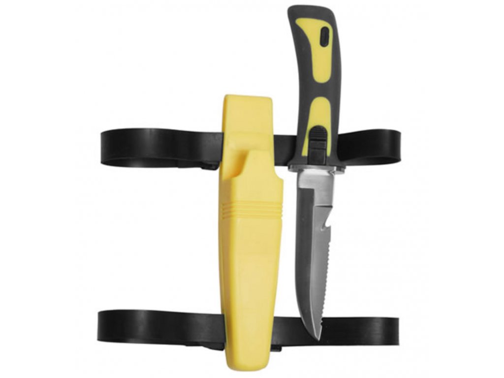 Potápěčský nůž s pevnou čepelí, bezpečně uložený v plastovém pouzdře. Pouzdro se díky dvěma širokým popruhům lehce a spolehlivě připne k noze. Rukojeť v barvách moře s obrysem...