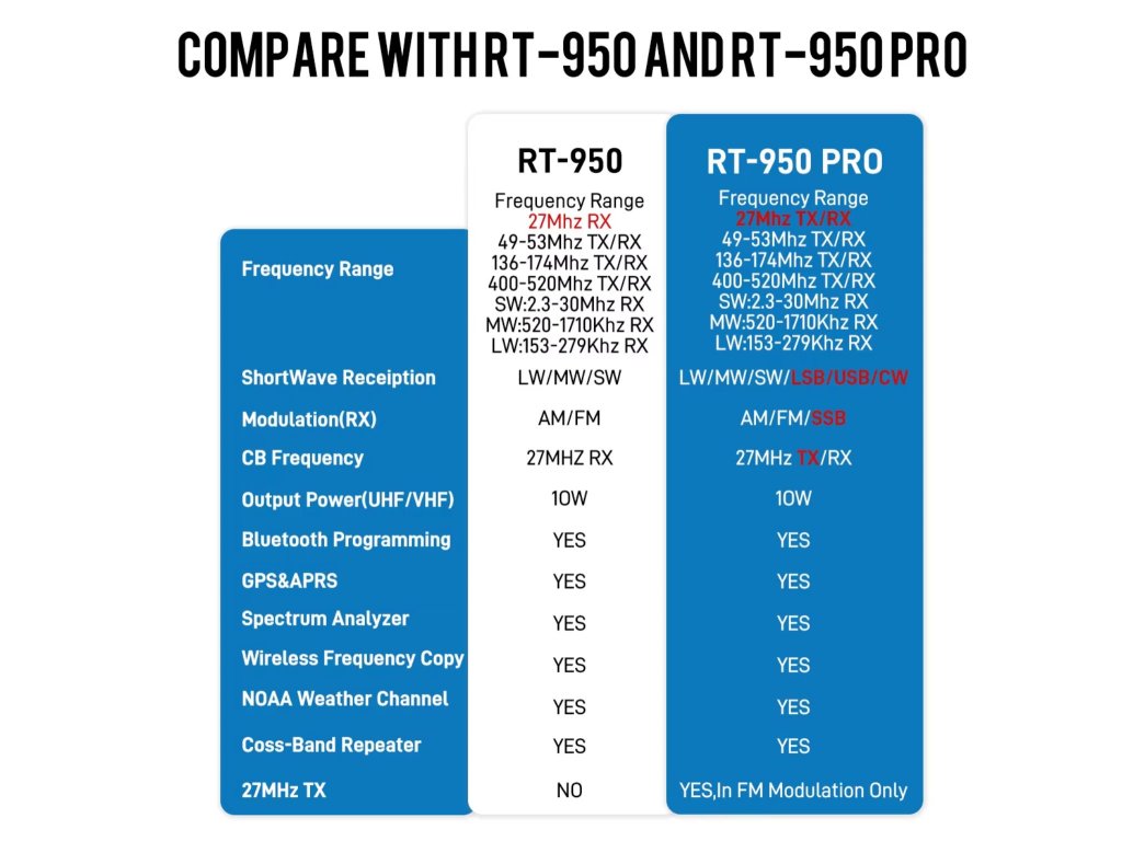 Varianta RT-950 PRO navíc umožňuje vysílání i na 27 MHz (CB) v FM modulaci – ideální volba pro uživatele, kteří chtějí mít ham i CB komunikaci v jedné stanici.