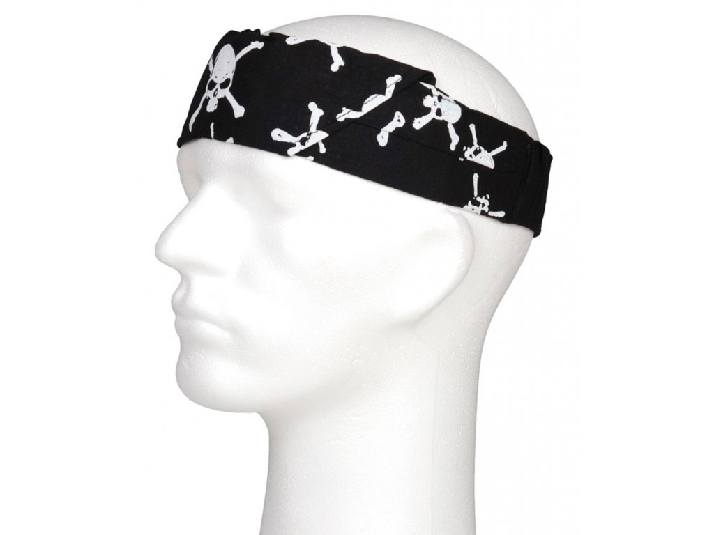 Šátek s potiskem Jolly Roger - pirátský znak, lebka a zkřížené hnáty. Tři varianty nošení, v zadní části široká guma.