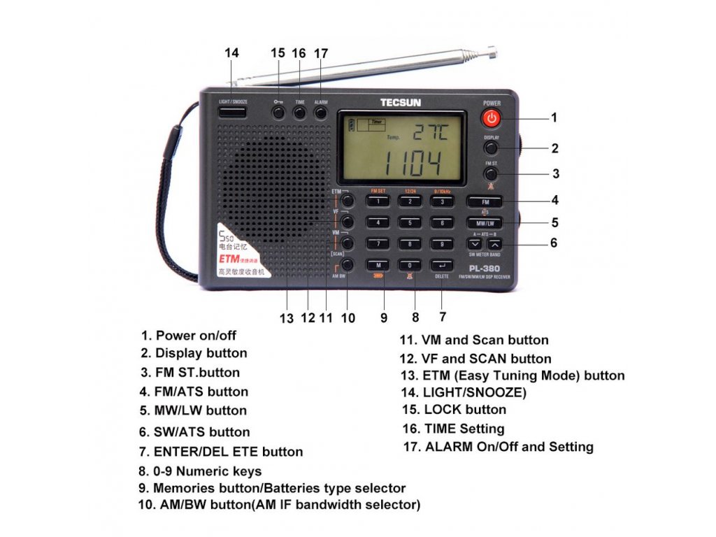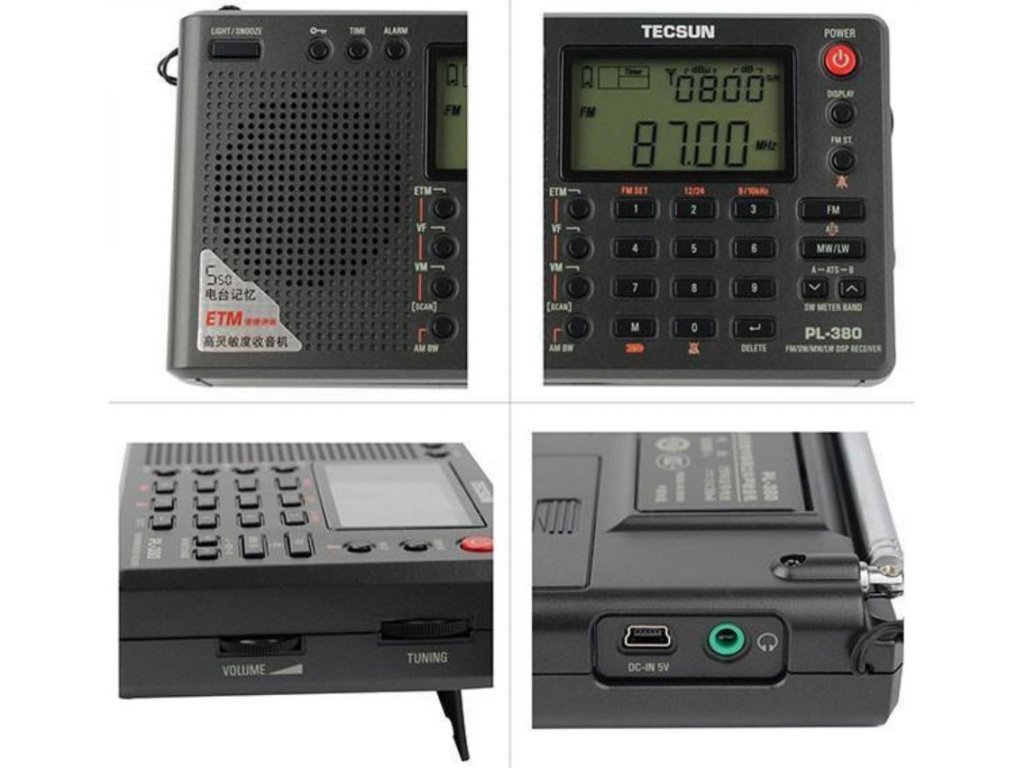 Tecsun PL-380 je přenosný prijímač vybaven DSP (Digital Signal Processing). Používá mikročipy DSP si4734 (od firmy Silicon Labs v USA) k digitalizaci analogové signální základny MW / FM / SW prostřednictvím moderních softwarových technologií a principů rádií. Výrazně zlepšuje citlivost, selektivitu, poměr S / N a rušení.